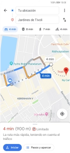 La información de la ruta aparece en la parte inferior de la pantalla y muestra la duración del viaje, la hora de llegada aproximada y la distancia al destino.