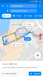 La información de la ruta aparece en la parte inferior de la pantalla y muestra la duración del viaje, la hora de llegada aproximada y la distancia al destino.